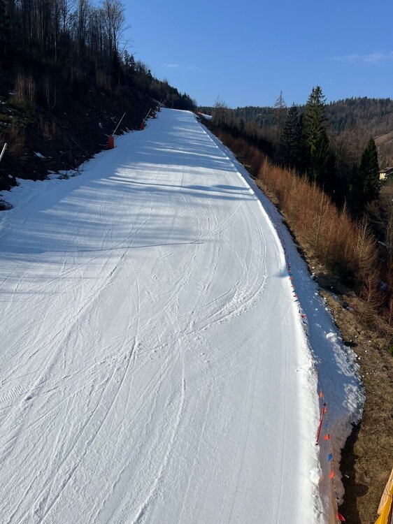 Mitek Napisano 19 Grudnia 2017 Udostępnij Napisano 19 Grudnia 2017 Co do naśnieżania to problemem jest zbyt mały mróz raczej, na dole armatki idą bo więcej zrobią, na górze zaś z lanc walą bo bardziej mrozi Niech teraz jeszcze setny raz sprawdzą wszystko, żeby nie było wtopy przy otwarciu Cześć Na jakiej podstawie tak twierdzisz? Pozdrowienia Cytuj Odnośnik do komentarza Udostępnij na innych stronach More sharing options... kordiankw Napisano 19 Grudnia 2017 Udostępnij Napisano 19 Grudnia 2017 Dojazd do dolnej stacji gondolki prawie na gotowo Wysłane z iPhone za pomocą Tapatalk Cytuj Odnośnik do komentarza Udostępnij na innych stronach More sharing options... ARossi88 Napisano 19 Grudnia 2017 Udostępnij Napisano 19 Grudnia 2017 Cześć Na jakiej podstawie tak twierdzisz? Pozdrowienia Szczyrkowski właśnie niedawno o tym gdzieś pisał, poza tym z tego co mi wiadomo lance najlepiej się sprawdzają od ok -8 st. a armatki chyba już od -4st., fakt są wydajniejsze ale zżerają więcej prądu niż wody Cytuj Odnośnik do komentarza Udostępnij na innych stronach More sharing options... bubol.T Napisano 19 Grudnia 2017 Udostępnij Napisano 19 Grudnia 2017 Naśnieżają głównie niebieskie trasy ,chyba na Golgotę trzeba będzie poczekać dłużej , 7 pewnie też nie zdążą na otwarcie ,a szkoda ,bo rozładowałaby ruch, budujące jest to ,że w końcu będzie można pojeździć trasą 1 do Czyrnej częściej niż raz na dwa lata Cytuj Odnośnik do komentarza Udostępnij na innych stronach More sharing options... ARossi88 Napisano 19 Grudnia 2017 Udostępnij Napisano 19 Grudnia 2017 Naśnieżają głównie niebieskie trasy ,chyba na Golgotę trzeba będzie poczekać dłużej , 7 pewnie też nie zdążą na otwarcie ,a szkoda ,bo rozładowałaby ruch, budujące jest to ,że w końcu będzie można pojeździć trasą 1 do Czyrnej częściej niż raz na dwa lata 25396066_1861171853958018_2695207762129783975_n.jpg Według raportu trasy 1,3,4,10 powinny być otwarte. Można liczyć na pogodę, bo ma zacząć nieźle sypać, może coś więcej otworzą Cytuj Odnośnik do komentarza Udostępnij na innych stronach More sharing options... kordiankw Napisano 19 Grudnia 2017 Udostępnij Napisano 19 Grudnia 2017 Info ze strony SMR: „Szczyrk, 19.12.2017 r. To już pewne! Otwieramy ośrodek 22.12.2017 r. Utrzymują się ujemne temperatury, dzięki czemu sprzęt naśnieżający może pracować na pełnych obrotach. Na trasy wyruszyły ratraki. Już w najbliższy piątek zapraszamy narciarzy i snowboardzistów na jazdę na naszych nowych trasach Szczyrk Mountain Resort. Miło nam poinformować, że ośrodek będzie czynny w okresie świątecznym. W Wigilię 24.12. jeździmy od 8:30 do 15:00, a 25.12. od 8:30 do 16:00. Pierwsza jazda wieczorna będzie 26.12.2017 r. W Nowy Rok 01.01.2018 r. otwieramy ośrodek od 9:30. „ I mapka naśnieżania : Wysłane z iPhone za pomocą Tapatalk Cytuj Odnośnik do komentarza Udostępnij na innych stronach More sharing options... bodex4 Napisano 19 Grudnia 2017 Udostępnij Napisano 19 Grudnia 2017 Info ze strony SMR: „Szczyrk, 19.12.2017 r. To już pewne! Otwieramy ośrodek 22.12.2017 r. Utrzymują się ujemne temperatury, dzięki czemu sprzęt naśnieżający może pracować na pełnych obrotach. Na trasy wyruszyły ratraki. Już w najbliższy piątek zapraszamy narciarzy i snowboardzistów na jazdę na naszych nowych trasach Szczyrk Mountain Resort. Miło nam poinformować, że ośrodek będzie czynny w okresie świątecznym. W Wigilię 24.12. jeździmy od 8:30 do 15:00, a 25.12. od 8:30 do 16:00. Pierwsza jazda wieczorna będzie 26.12.2017 r. W Nowy Rok 01.01.2018 r. otwieramy ośrodek od 9:30. „ I mapka naśnieżania : Wysłane z iPhone za pomocą Tapatalk Jaki jest adres do tej strony z mapką ??? Cytuj Odnośnik do komentarza Udostępnij na innych stronach More sharing options... kordiankw Napisano 19 Grudnia 2017 Udostępnij Napisano 19 Grudnia 2017 Jaki jest adres do tej strony z mapką ??? http://www.szczyrkow...ountain-resort/ Wysłane z iPhone za pomocą Tapatalk Cytuj Odnośnik do komentarza Udostępnij na innych stronach More sharing options... bodex4 Napisano 19 Grudnia 2017 Udostępnij Napisano 19 Grudnia 2017 dzięki, a trasa przy orczyku na Małe Skrzyczne nie są naśnieżane? Cytuj Odnośnik do komentarza Udostępnij na innych stronach More sharing options... moruniek Napisano 20 Grudnia 2017 Udostępnij Napisano 20 Grudnia 2017 Na Hali Pośredniej mamy nową ruchomą kamerę: http://www.szczyrkow...ednia-820-m-nm/ Cytuj Odnośnik do komentarza Udostępnij na innych stronach More sharing options... marek_s Napisano 20 Grudnia 2017 Udostępnij Napisano 20 Grudnia 2017 Na Hali Pośredniej mamy nową ruchomą kamerę: http://www.szczyrkow...ednia-820-m-nm/ ... na której teraz niewiele widać, bo taka jest mgła. Wg icm, piątek jeszcze gorszy: http://www.meteo.pl/...ntype=0u&id=716 Miejmy nadzieję, że się nie sprawdzi. Kto się wybiera na otwarcie? Cytuj Odnośnik do komentarza Udostępnij na innych stronach More sharing options... pakalolo Napisano 22 Grudnia 2017 Udostępnij Napisano 22 Grudnia 2017 krótka recenzja z dzisiejszego otwarcia bo akurat wróciłem: 1. Jeżeli chodzi o samą infrastrukturę to wygląda to naprawdę dobrze. WIdać przemyśleli temat i zarówno krzesło jak i gondola są szybkie i mają dużą przepustowość. Mimo natłoku ludzi nie było kolejek. Niestety wyciągi często stawały i mieli jakieś tam problemy, mam nadzieję że się ogarną. Oczywiście standardowo brakuje mi na wzór austryjacki jednej dużej knajpki samoobsługowej z fajnym wyborem żarcia i dużą ilością miejsca. 2. Przygotowanie do otwarcia niestety fatalne bo otworzyli tylko trasy 3 i 4. Dzisiaj odwilż, trasy do połowy były twarde i znośne ale niżej katastrofa, kamienie i bardzo miękko. Do tego szerokość trasy 4 była naprawde marna, nie wiem po co aż tak wcześnie otwierali tą część- pewnie ze względ