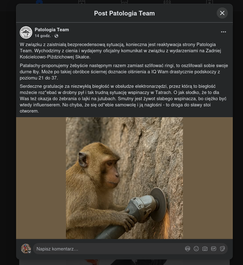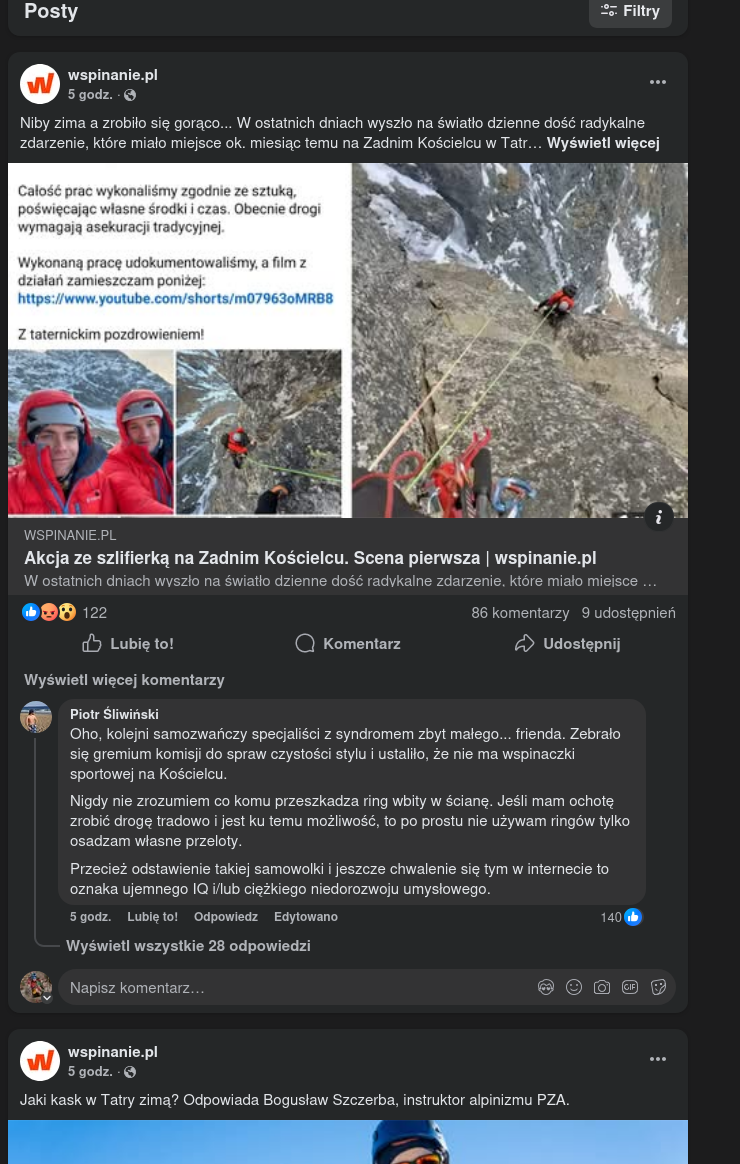 lubeckim Napisano 56 minut temu Udostępnij Napisano 56 minut temu (edytowane) To, co ostatnio stało się w Tatrach jest tak "niesamowite", że aż brakuje słów, żeby to opisać. Tak w skrócie: Dwóch wspinaczy z pewnego klubu wysokogórskiego z pogranicza Śląska i Małopolski, ponoć będąc pod psychicznym wpływem pewnego znanego, ale skonfliktowanego ze środowiskiem Taternika, wycieli stałe punkty asekuracyjne na 3 drogach na Zadnim Kościelcu w Tatrach. Po prostu wpadli tam z akumulatorowym diaksem i powycinali szpilki gwintowane, kotwy, plakietki itp. Dzielni operatorzy elektronarzędzi dość szybko jurgneli się, że jest przypał i ich dumny post spadł na pewnej grupie na Facebook z rowerka Jak to jednak bywa w takich przypadkach, w Internetach nic nie ginie a wieść o wyczynach tych dwóch, nieskalanych rozumem twarzy, poniosła się daleeeeko. Aha, bo oni to oczywiście ogłosili Urbi et Orbi pod własnym nazwiskiem. Całą akcję nagrali na GoPro, wrzucili film na YT a wspomnianego posta okrasili dumną samojebką zrobioną po udanej akcji. Oczywiście ciśnienie w branży jest takie, że gdyby to było tylko powietrze, to nie jedną butle nurkową można było by napełnić. W większości jest to jednak strumień szamba i dowolnie inaczej wyrażanego niezadowolenia Niektórzy proponują, że aby sprawiedliwości ludowej stało się zadość, to dzielnym szlifierzom należy zrobić symulację lat 90tych. Ba! Ja to bym poszedł krok dalej! Lata 90te w Łodzi, względnie w Katowicach na Załężu! Jak patologia, to na całego https://wspinanie.pl/2025/11/akcja-ze-szlifierka-na-zadnim-koscielcu/ PS. Powyższy screen, kończący się na artykule o kaskach to nie żadna tam tania prowokacja z mojej strony 😛 Edytowane 56 minut temu przez lubeckim Cytuj Odnośnik do komentarza Udostępnij na innych stronach More sharing options...